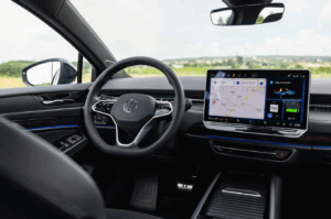 Im Mittelpunkt steht ein durchgehendes „Superscreen“-Display, das Instrumente und Infotainment elegant verbindet. Klassische Schalter weichen weitgehend digitalen Bedienelementen. Das kompakte Dreispeichenlenkrad mit Walzensteuerung sorgt für eine moderne, aufgeräumte Optik.