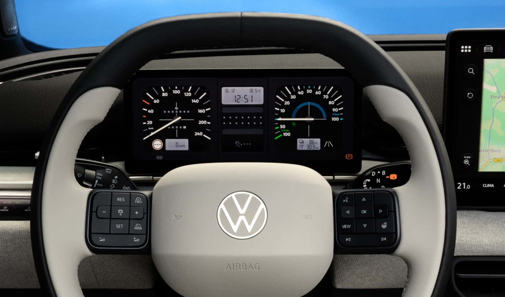 Besonders auffällig: die Retro‑Displays, die klassische VW‑Instrumente digital nachbilden – vom Golf‑Drehzahlmesser bis zu einem virtuellen Kassettenrekorder. Kleine Augenzwinkereien, die den Innenraum sympathisch und einzigartig machen.
